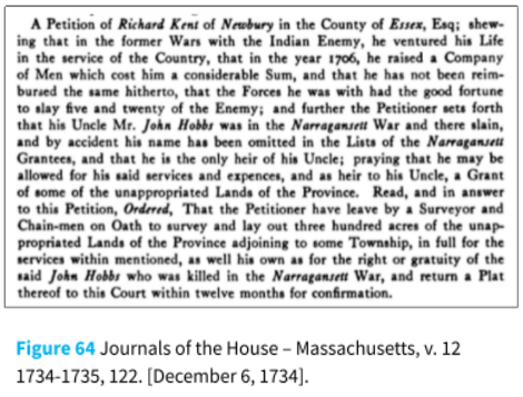 In February 1730, the House granted a petition for Narraganset land from heirs of soldiers who fought in what was referred to as the Narraganset War (First Anglo-Abenaki War, Pometacomet’s Resistance/King Philip’s War). The House ordered that groups of 120 people whose claims were approved each be allotted six-square miles to establish a township.